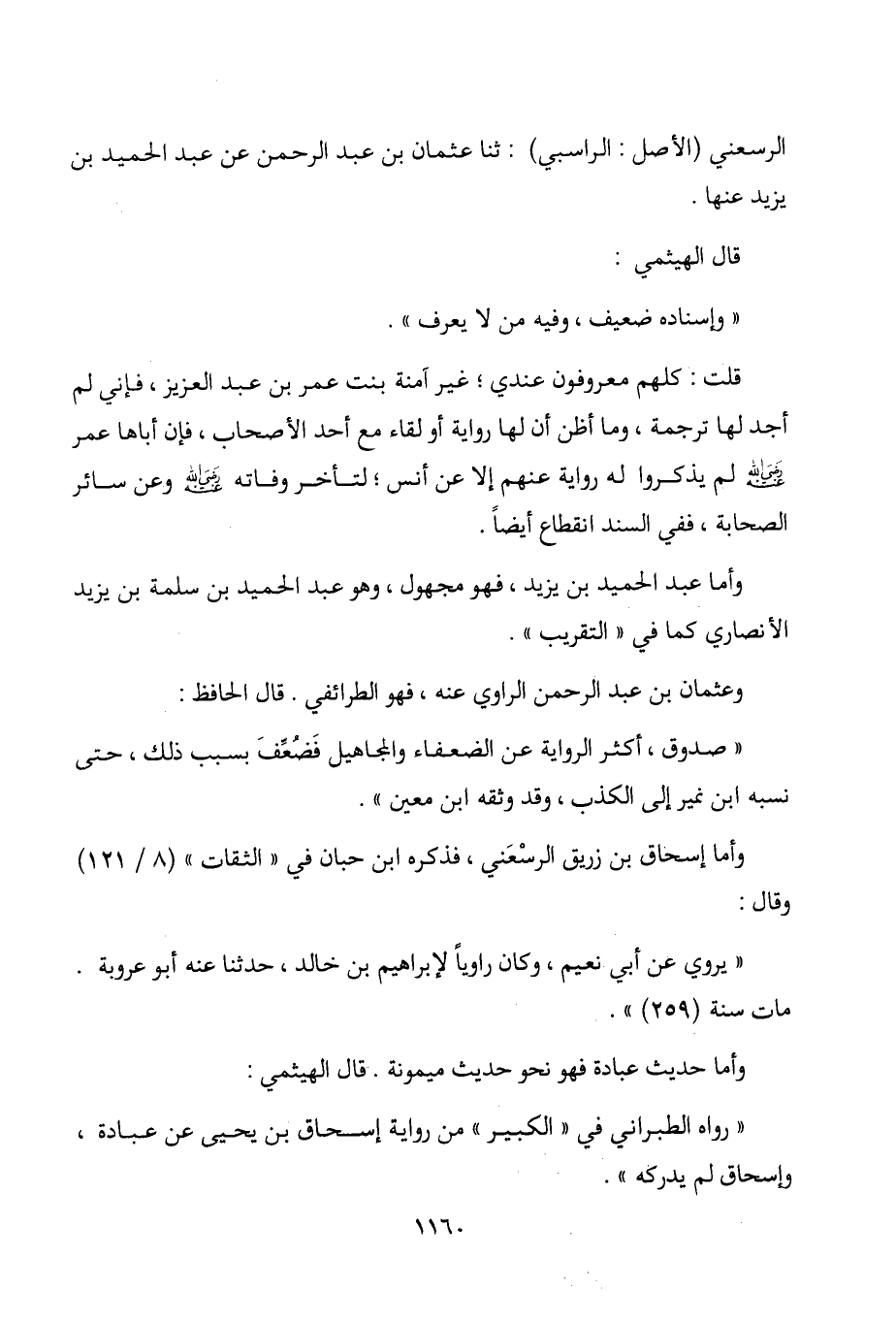 عبد الرحمن عن عبد الحميد بن يزيد عنها. قال الهيثمي: " وإسناده ضعيف،