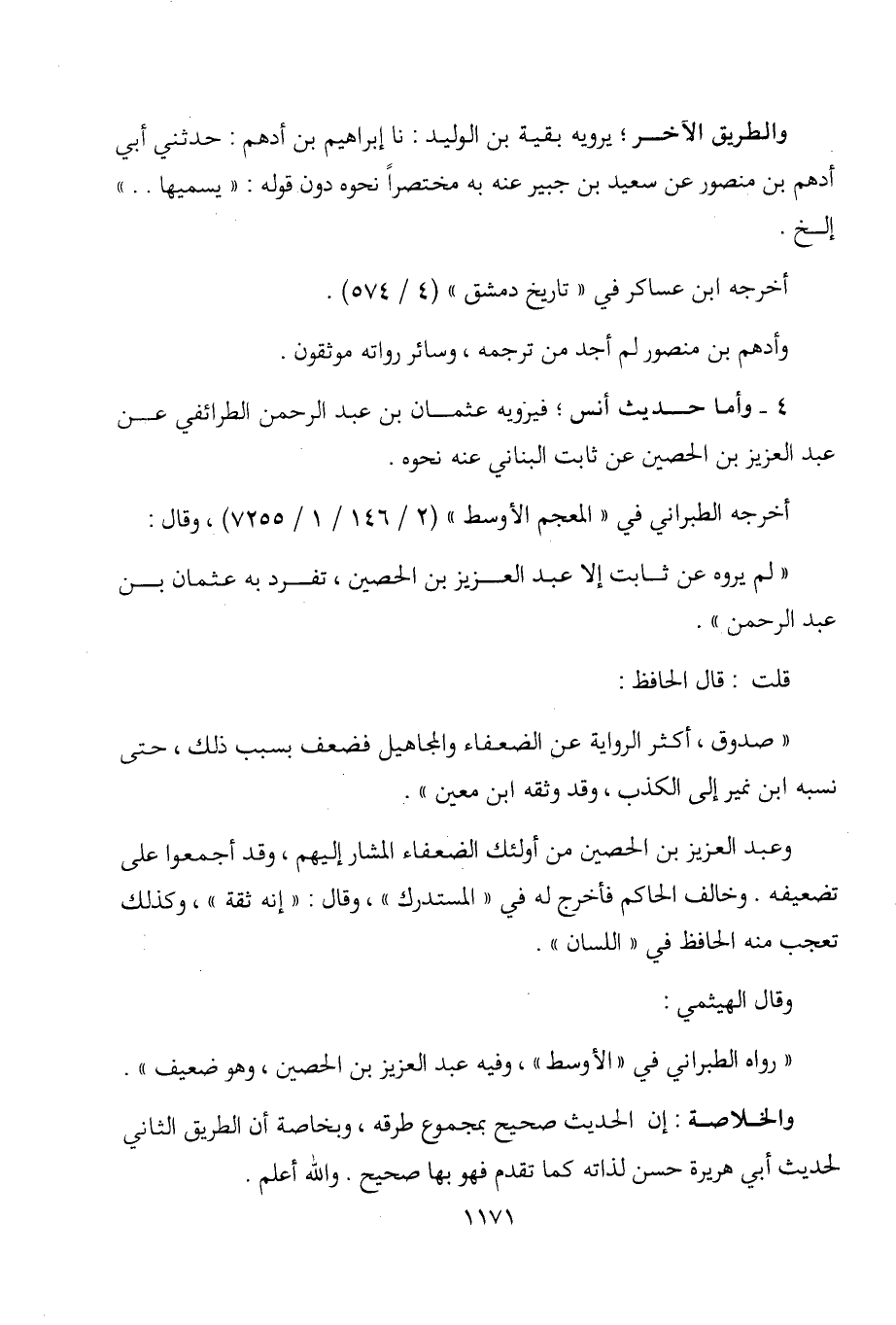 نسبه ابن نمير إلى الكذب، وقد وثقه ابن معين ". وعبد العزيز بن الحصين من
