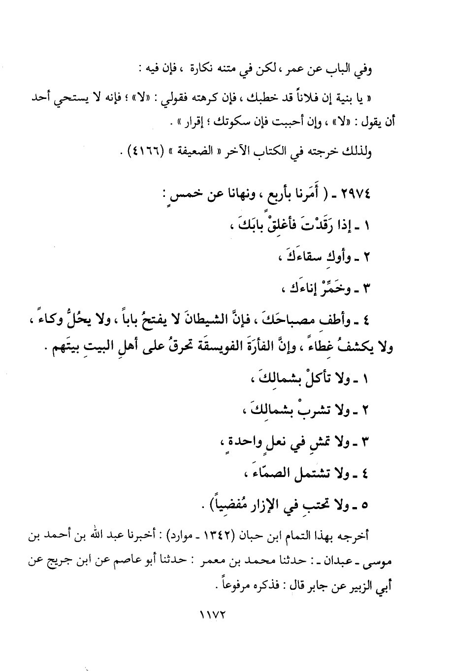 ولا تأكل بشمالك، 2 - ولا تشرب بشمالك، 3 - ولا تمش في نعل واحدة، 4 -