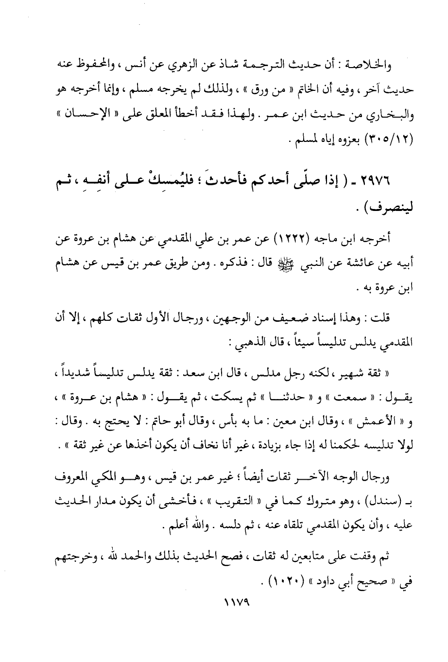 2976 - " إذا صلى أحدكم فأحدث، فليمسك على أنفه، ثم لينصرف ".