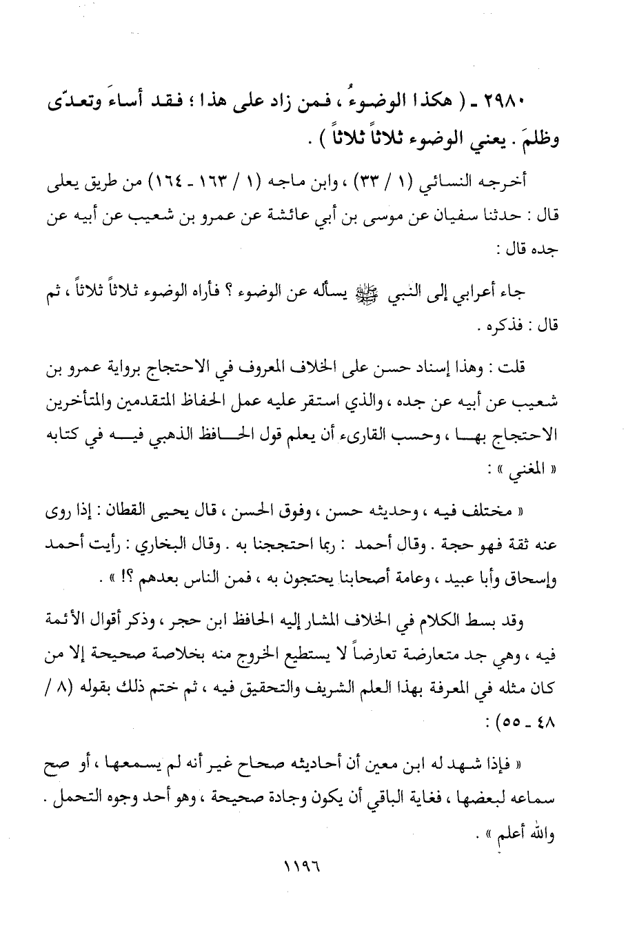 2980 - " هكذا الوضوء، فمن زاد على هذا، فقد أساء وتعدى وظلم. يعني الوضوء ثلاثا