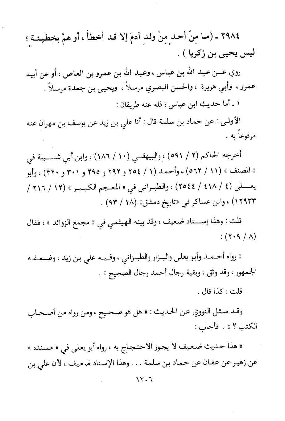 2984 - " ما من أحد من ولد آدم إلا قد أخطأ، أو هم بخطيئة، ليس يحيى بن زكريا ".