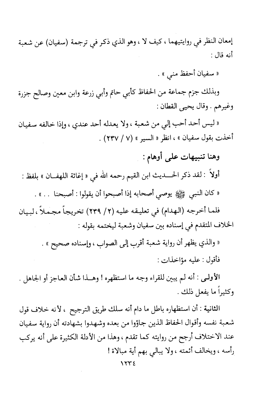 شعبة أقرب إلى الصواب، وإسناده صحيح ". فأقول: عليه مؤاخذات: الأولى: أنه