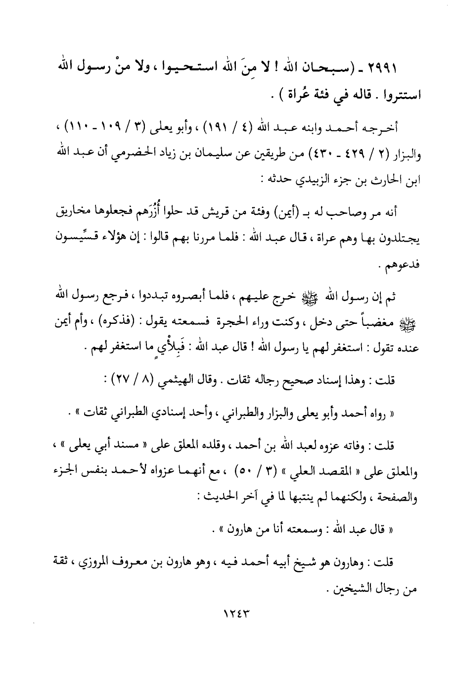 2991 - " سبحان الله! لا من الله استحيوا، ولا من رسول الله استتروا. قاله في فئة