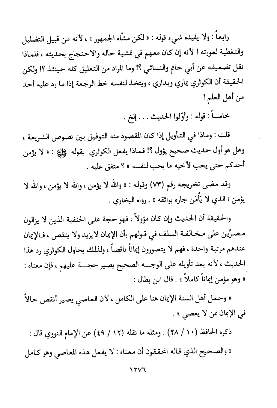 ولذلك يحاول الكوثري رد هذا الحديث، لأنه بعد تأويله على الوجه الصحيح يصير