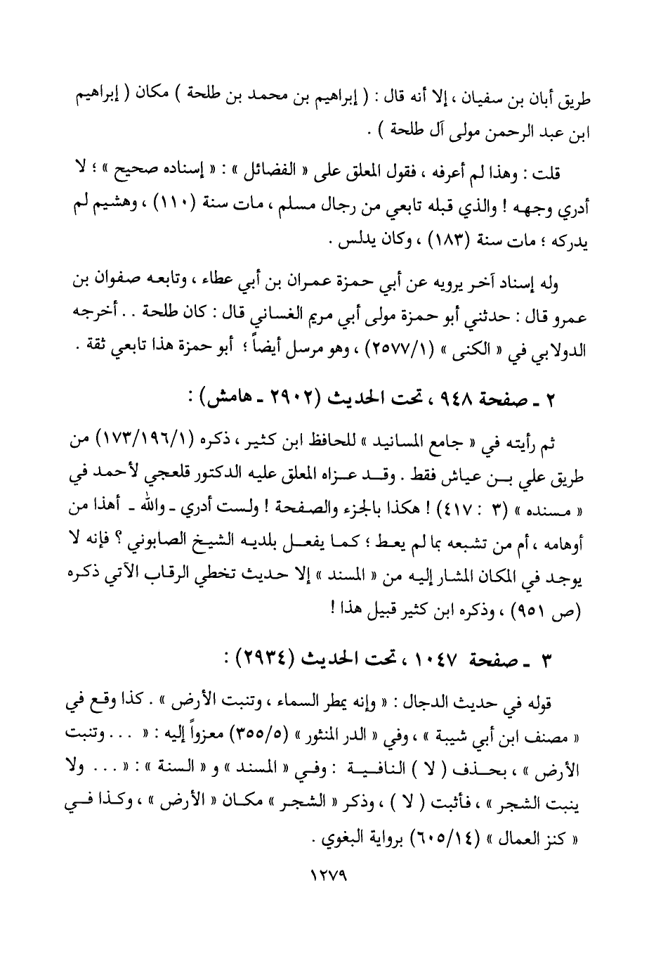 ثم رأيته في "جامع المسانيد" للحافظ ابن كثير، ذكره (1/196/173) من طريق علي بن عياش فقط. وقد عزاه المعلق عليه الدكتور قلعجي لأحمد في "مسنده" (3: 417) ! هكذا بالجزء والصفحة! ولست أدري -والله- أهذا من أوهامه، أم من تشبعه بما لم يعط؛ كما يفعل بلديه الشيخ الصابوني؟ فإنه لا يوجد في المكان المشار إليه من "المسند" إلا حديث تخطي الرقاب الآتي ذكره (ص 951) ، وذكره ابن كثير قبيل هذا!