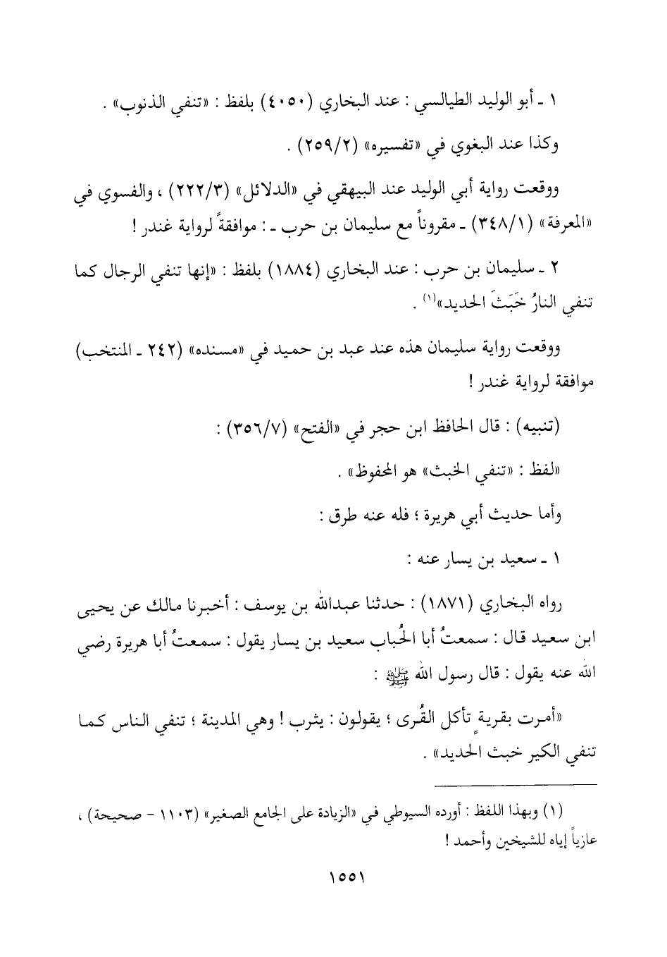 2- سليمان بن حرب: عند البخاري (1884) بلفظ: "إنها تنفي الرجال كما تنفي النارُ خبثَ الحديد" (¬1) .