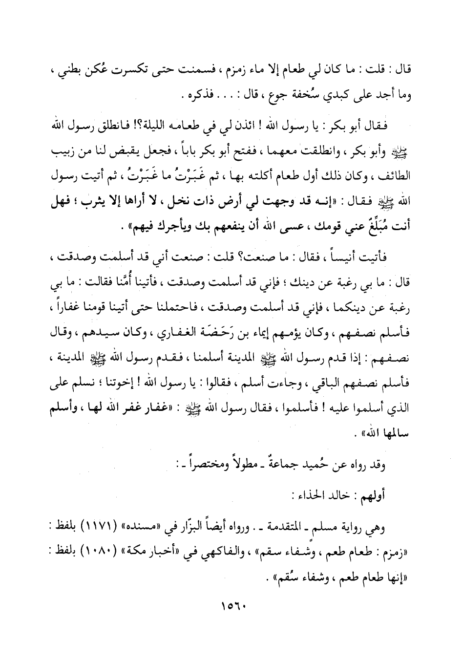 فقال أبو بكر: يا رسول الله! ائذن لي في طعامه الليلة؟! فانطلق رسول الله- صلى الله عليه وسلم - وابوبكر، وانطلقت معهما، ففتح أبوبكر باباً، فجعل يقبض لنا من زبيب. الطائف، وكان ذلك أول طعام أكلته بها، ثم غَبَرْتُ ما غَبَرْتُ، ثم أتيت رسول الله - صلى الله عليه وسلم - فقال: "إنه قد وجهت لي أرض ذات نخل، لا أراها إلا يثرب؛ فهل أنت مُبَلِّغٌ عني قومك، عسى الله أن ينفعهم بك وبأجرك فيهم ".
