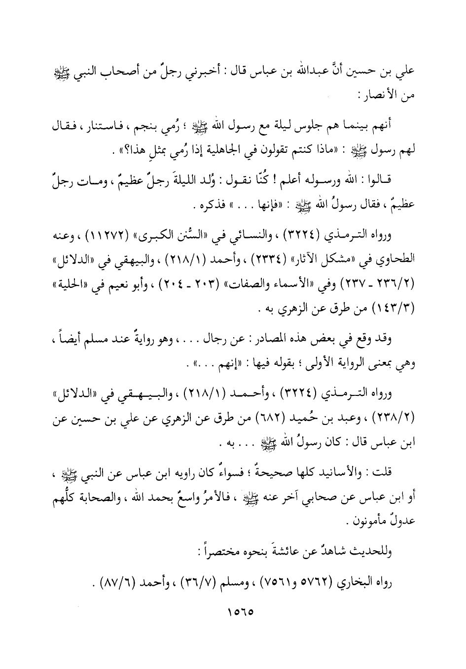 ورواه الترمذي (3224) ، والنسائي في "السّنن الكبرى " (11272) ، وعنه الطحاوي في "مشكل الآثار" (2334) ، وأحمد (1/218) ، والبيهقي في " الدلائل " (2/236- 237) وفي "الأسماء والصفات " (203- 204) ، وأبو نعيم في "الحلية" (3/143) من طرق عن الزهري به.