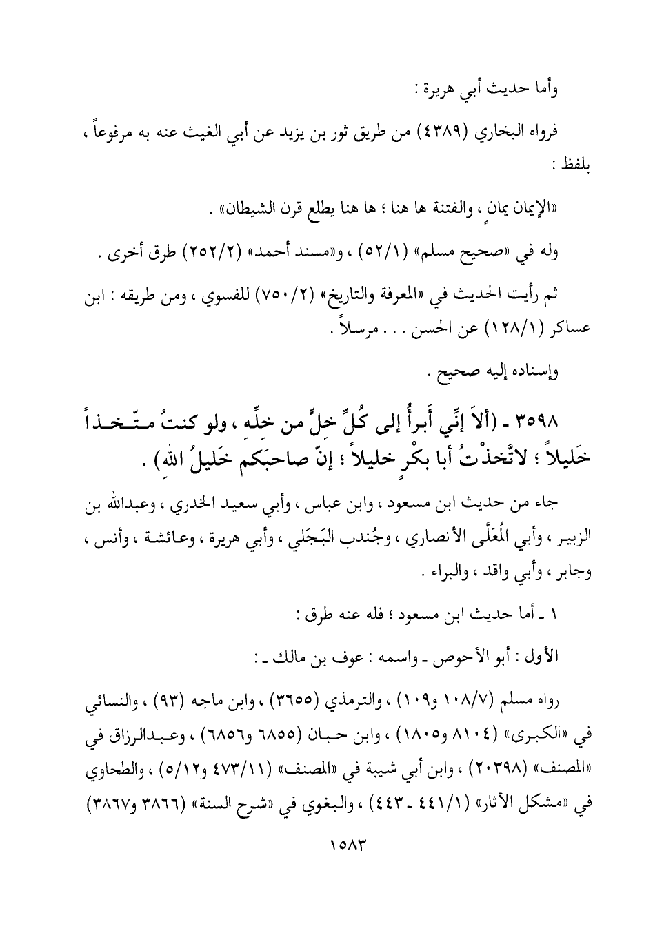 3598- (ألآ إنِّي أَبرأُ إلى كُلِّ خِلٍّ من خِلِّهِ، ولو كنتُ متخذاً خليلاً، لاتَّخذتُ أبا بكرٍ خليلاً؛ إنّ صاحبَكم خليلُ الله) .