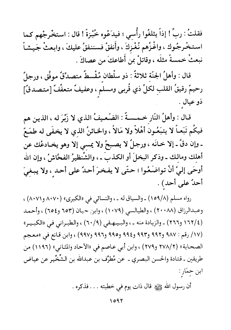 رواه مسلم (8/159) - والسياق له-، والنسائي في "الكبرى" (8070 و 8071) ، وعبد الرزاق (20088) ، والطيالسي (1079) ، وابن حبان (653 و654) ، وأحمد (4/162 و266) - والزيادة منه-، والبيهقي (9/ 60) ، والطبراني في "الكبير" (17/ رقم: 987 و992 و993 و994و995 و996 و997) ، وابن قانع في "معجم الصحابة " (2/278 و 279) ، وابن أبي عاصم "الآحاد والمثاني " (1196) من طريقين- قتادة والحسن البصري- عن مطرف بن عبد الله بن الشخير عن عياض ابن حمار: