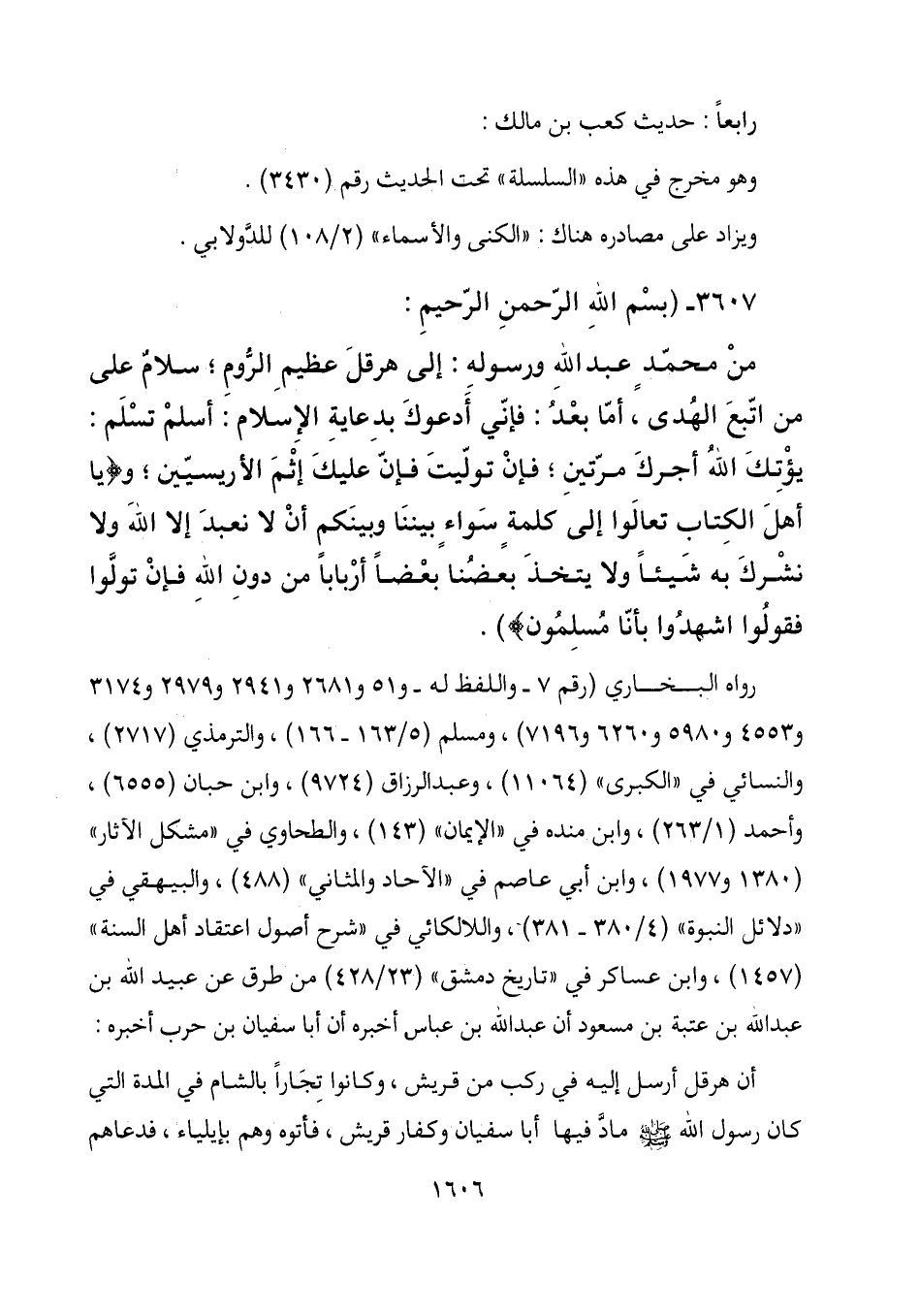 رواه البخاري (رقم 7- واللفظ له - و 51 و 2681 و 2941 و 2979 و 3174 و 4553 و 5980 و 6260 و 7196) ، ومسلم (5/163 - 166) ، والترمذي (2717) ، والنسائي في "الكبرى" (11064) ، وعبد الرزاق (9724) ، وابن حبان (6555) ، وأحمد (1/263) ، وا بن منده في "الإيمان " (143) ، والطحاوي في "مشكل الآثار" (1380و 1977) ، وابن أبي عاصم في "الآحاد والمثاني " (488) ، والبيهقي في "دلائل النبوة" (4/380 - 381) -، واللالكائي في "شرح أصول اعتقاد أهل السنة " (1457) ، وابن عساكر في "تاريخ دمشق " (23/428) من طرق عن عبيد الله بن عبد الله بن عتبة بن مسعود أن عبد الله بن عباس أخبره أن أبا سفيان بن حرب أخبره: أن هرقل أرسل إليه في ركب من قريش، وكانوا تجاراً بالشام في المدة التي كان رسول الله - صلى الله عليه وسلم - مادَّ فيها أبا سفيان وكفار قريش، فأتوه وهم بإيلياء، فدعاهم