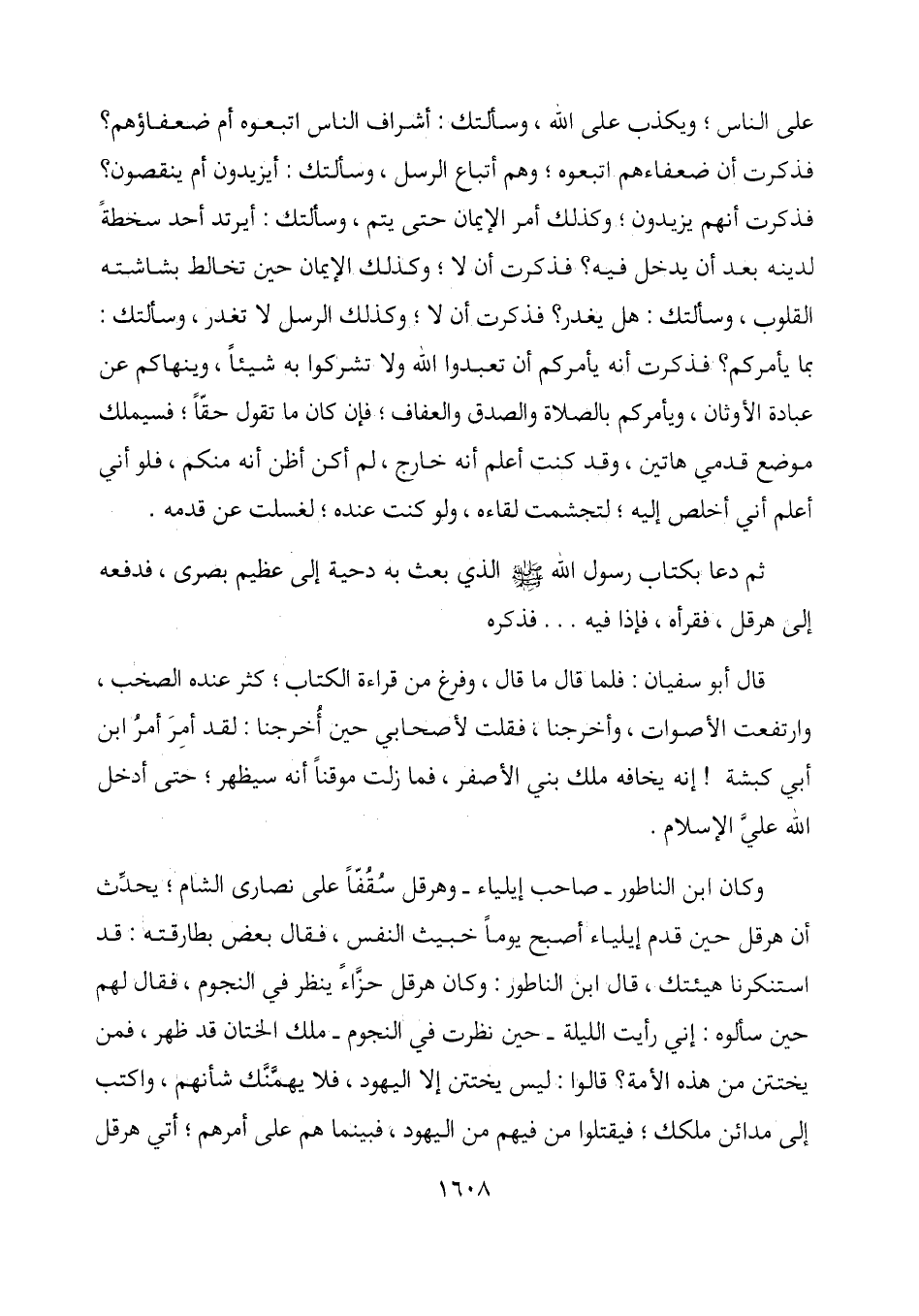 على الناس؛ ويكذب على الله، وسألتك: أشراف الناس اتبعوه أم ضعفاؤهم؟ فذكرت أن ضعفاءهم اتبعوه؛ وهم أتباع الرسل، وسألتك: أيزيدون أم ينقصون؟ فذكرت أنهم يزيدون؛ وكذلك أمر الإيمان حتى يتم، وسألتك: أيرتد أحد سخطةً لدينه بعد أن يدخل فيه؟ فذكرت أن لا؛ وكذلك الإيمان حين تخالط بشاشته القلوب، وسألتك: هل يغدر؟ فذكرت أن لا؛ وكذلك الرسل لا تغدر، وسألتك: بما يأمركم؟ فذكرت أنه يأمركم أن تعبدوا الله ولا تشركوا به شيئاً، وينهاكم عن عبادة الأوثان، ويأمركم بالصلاة والصدق والعفاف؛ فإن كان ما تقول حقاً؛ فسيملك موضع قدمي هاتين، وقد كنت أعلم أنه خارج، لم أكن أظن أنه منكم، فلو أني أعلم أني أخلص إليه؛ لتجشمت لقاءه، ولو كنت عنده؛ لغسلت عن قدمه.