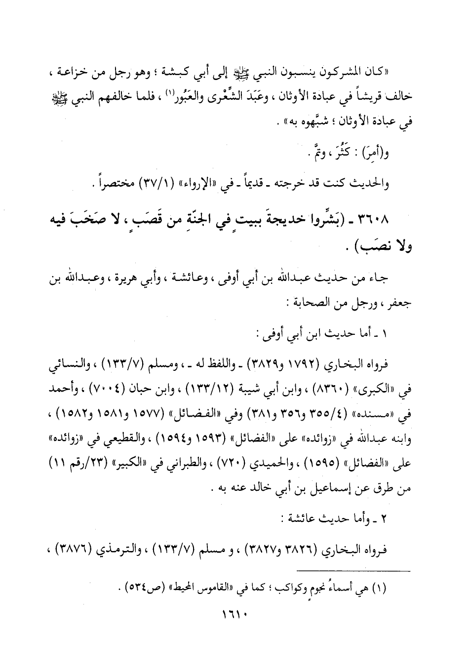 3608- (بَشِّروا خديجة في الجنة ببيت من قصبٍ , لا صخب فيه ولا نصَب) .