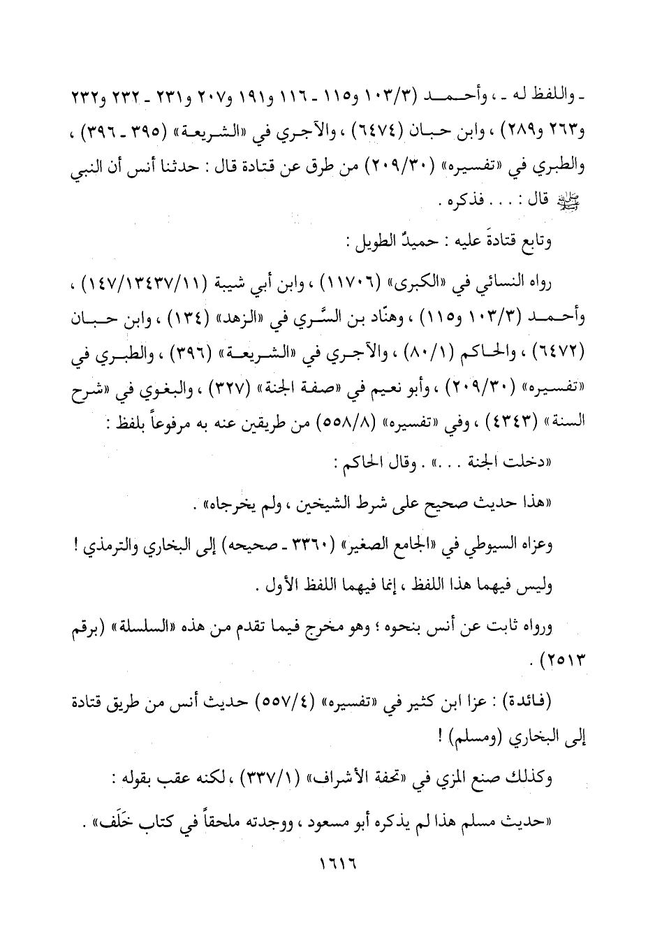واللفظ له -، وأحمد (3/103 و115- 116 و191 و207 و231- 232 و232 و 263 و 289) ، وابن حبان (6474) ، والآجري في "الشريعة " (395- 396) ، والطبري في "تفسيره " (30/209) من طرق عن قتادة قال: حدثنا أنس أن النبي - صلى الله عليه وسلم - قال: ... فذكره.