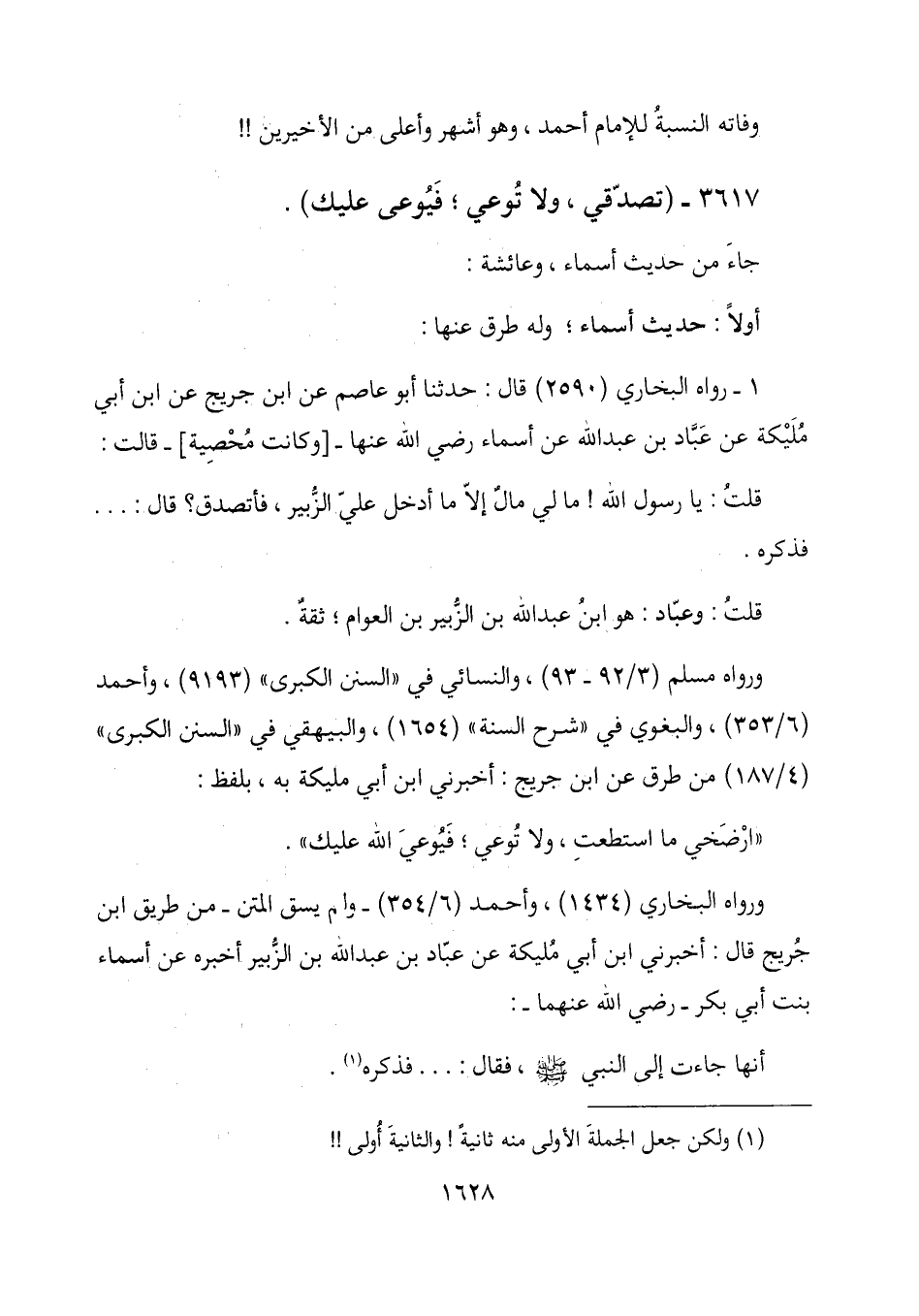 3617- (تصدّقي، ولا تُوعي؛ فيُوعى عليك) .