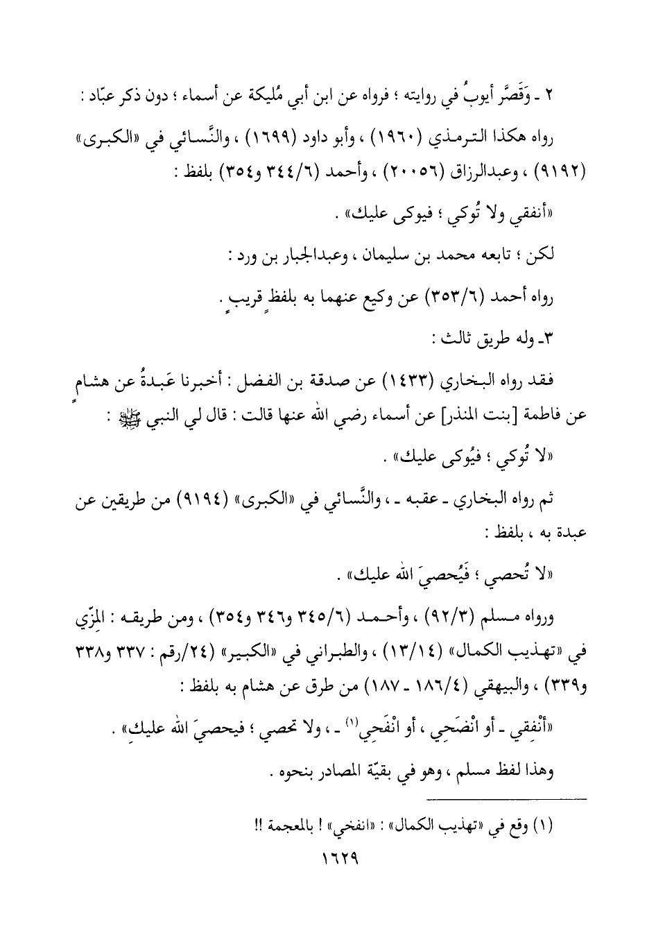 ثم رواه البخاري - عقبه -، والنسائي في "الكبرى " (9194) من طريقين عن عبدة به، بلفظ: " لا تحصي؛ فيحصي الله عليك ".