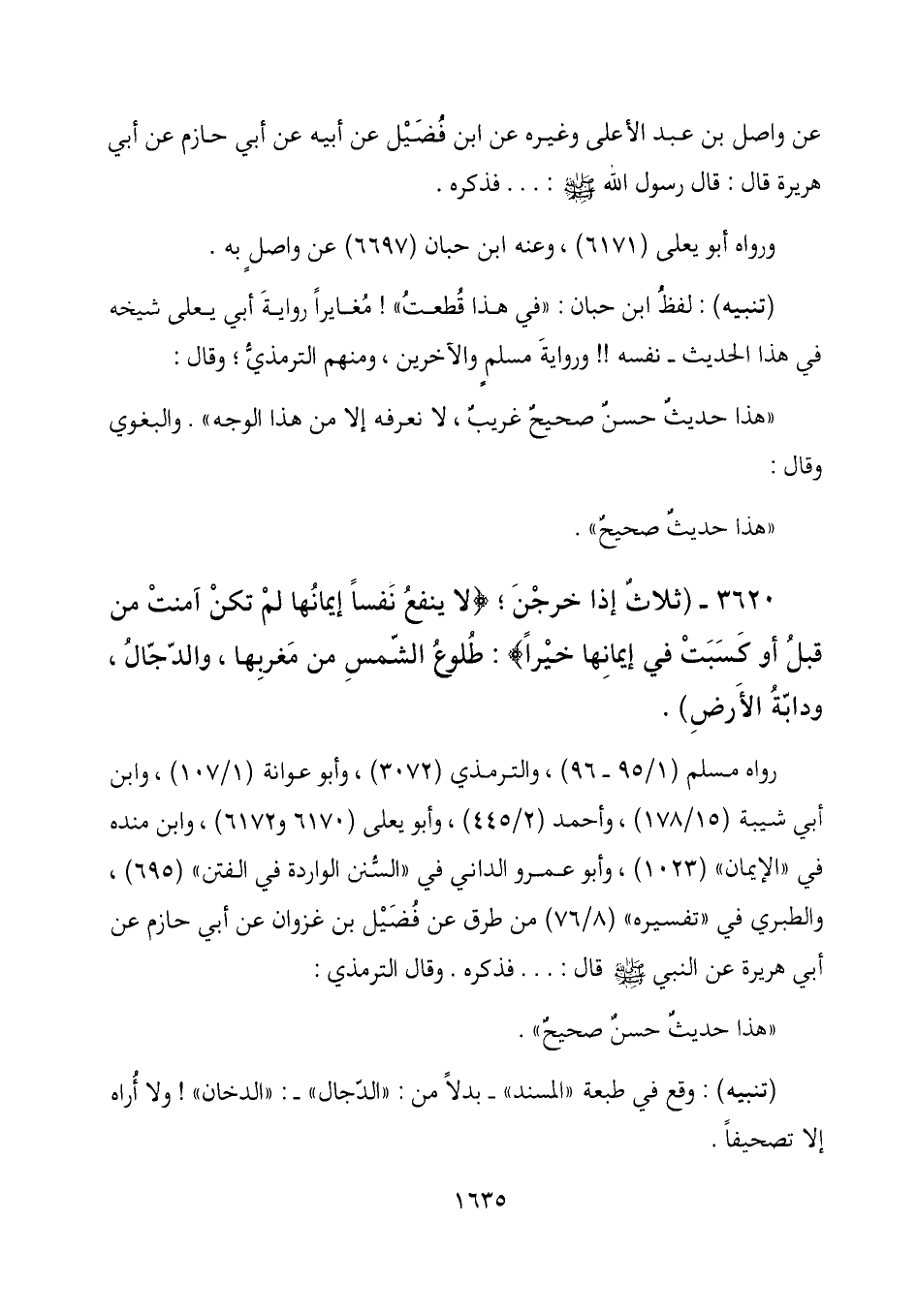 عن واصل بن عبد الأعلى وغيره عن ابن فضيل عن أبيه عن أبي حازم عن أبي هريرة قال: قال رسول الله - صلى الله عليه وسلم -: ... فذكره.
