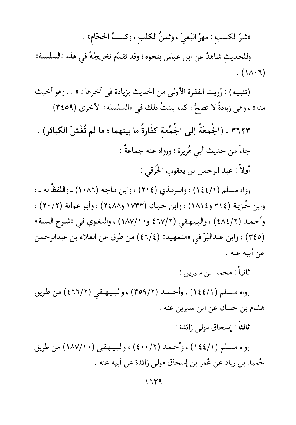 3623- (الجُمعَةُ إلى الجُمُعةِ كفّارةُ ما بينهما؛ ما لم تُغْشَ الكبائر) .
