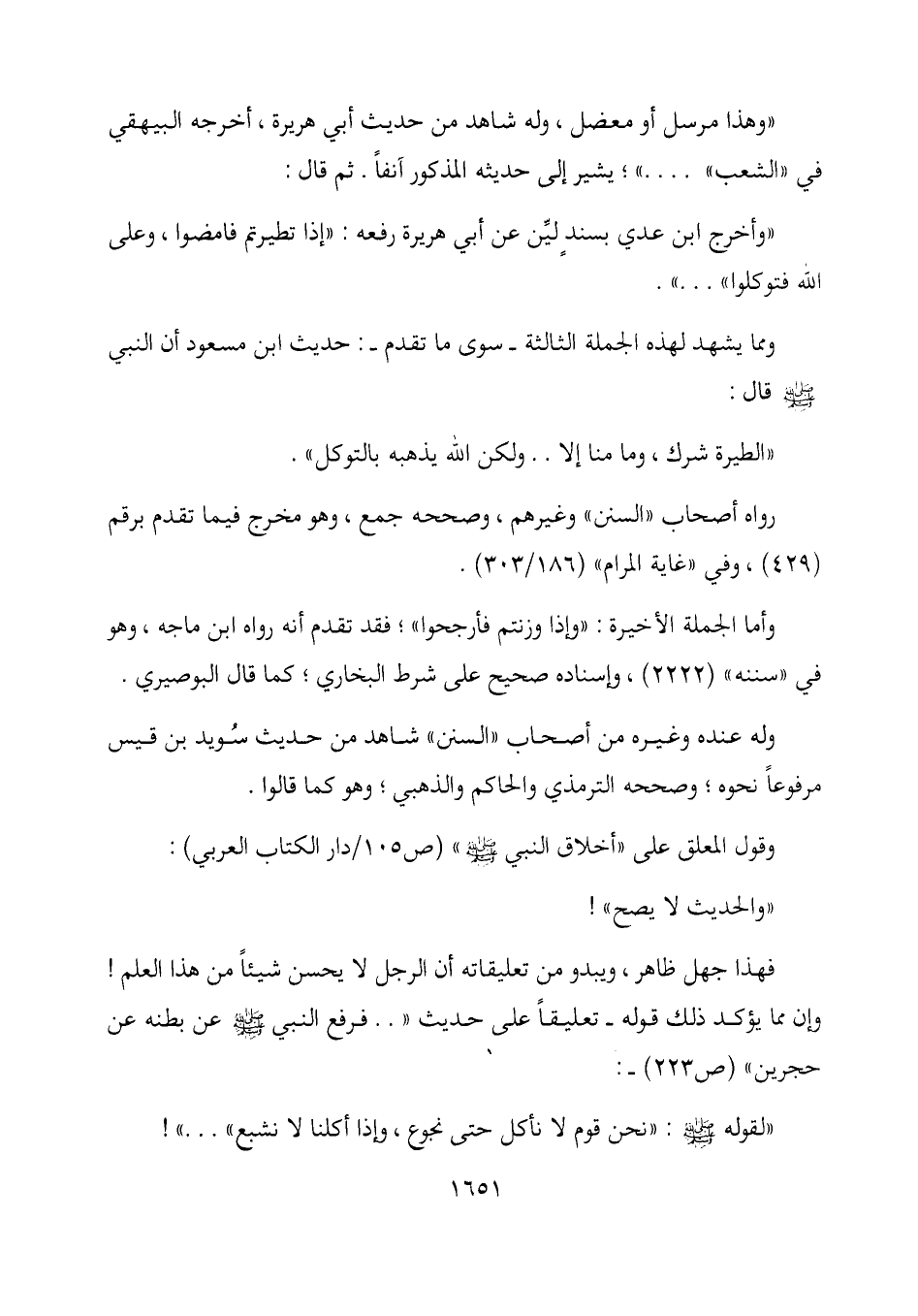 فهذا جهل ظاهر، ويبدو من تعليقاته أن الرجل لا يحسن شيئاً من هذا العلم! وان مما يؤكد ذلك قوله- تعليقاً على حديث ".. فرفع النبي - صلى الله عليه وسلم - عن بطنه عن حجرين " (ص 223) -:
