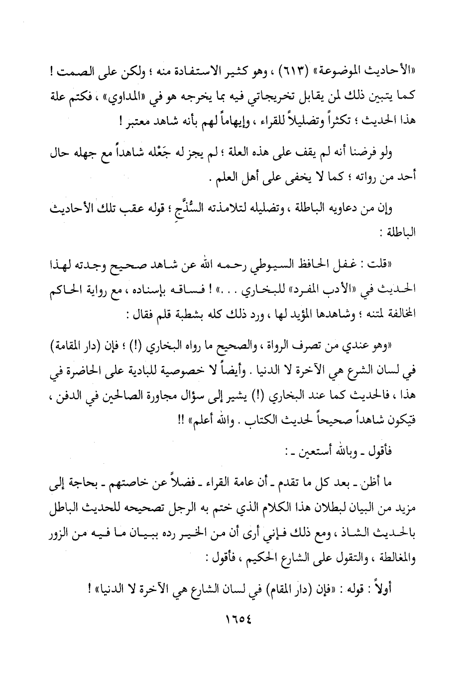 وإن من دعاويه الباطلة، وتضليله لتلامذته السٌّذَّجِ؛ قوله عقب تلك الأحاديث الباطلة: