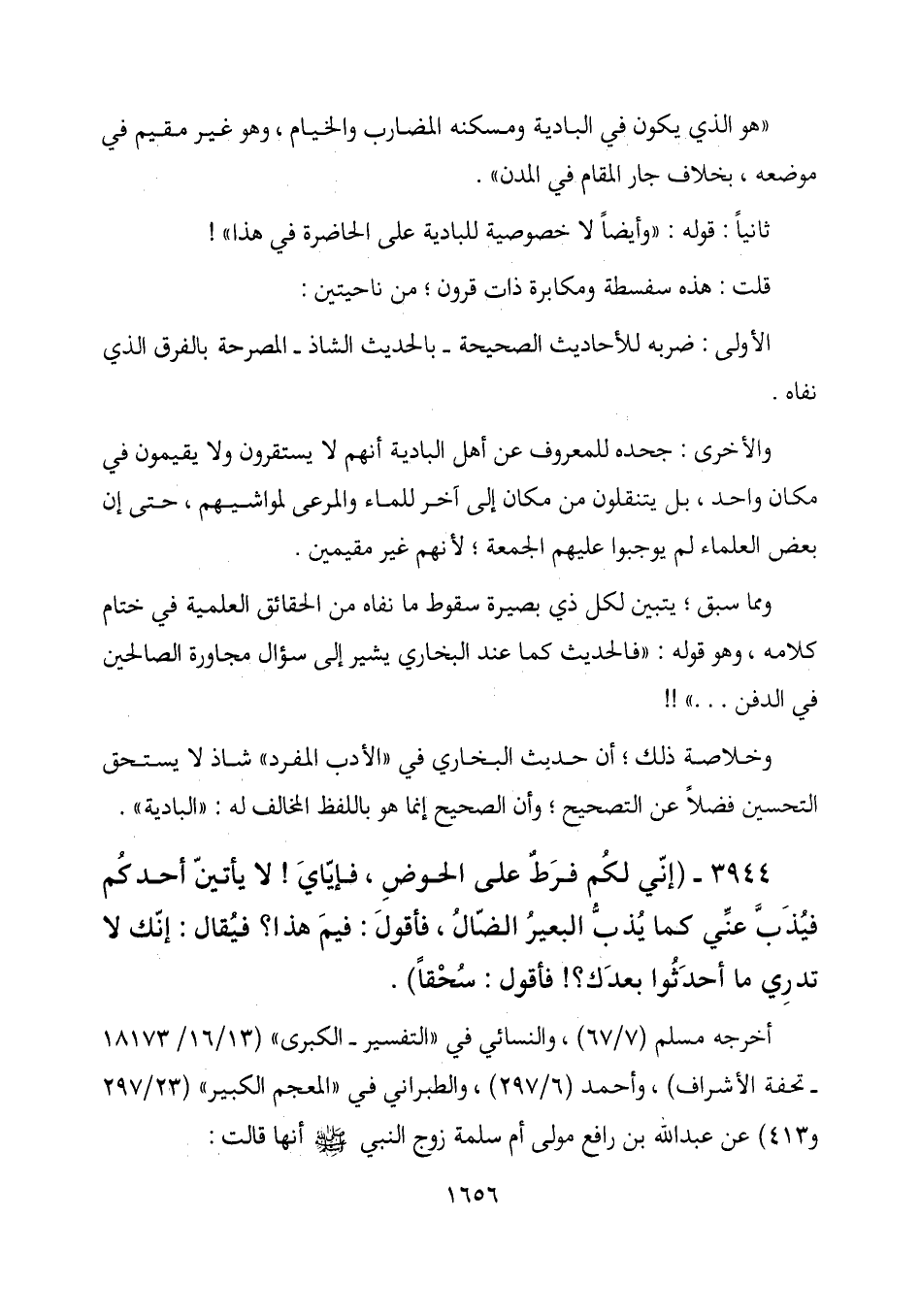 وخلاصة ذلك؛ أن حديث البخاري في "الأدب المفرد" شاذ لا يستحق التحسين فضلاً عن التصحيح؛ وأن الصحيح إنما هو باللفظ المخالف له: "البادية".