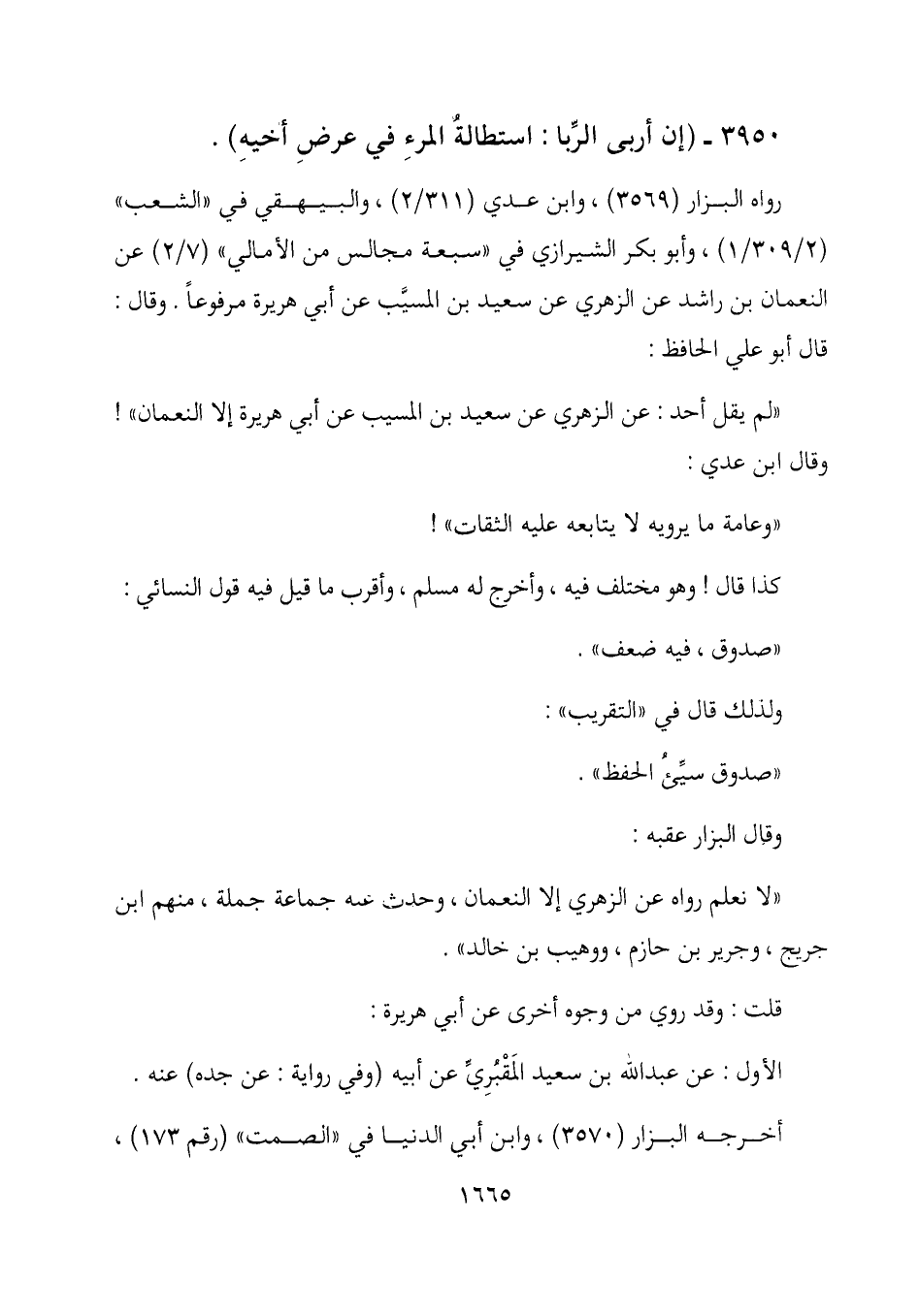 "لم يقل أحد: عن الزهري عن سعيد بن المسيب عن أبي هريرة إلا النعمان "! وقال ابن عدي: