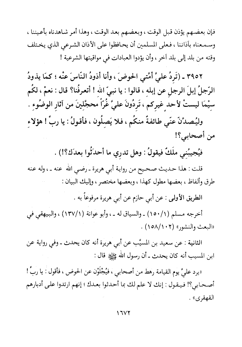 3952- (تَرِدُ عليَّ أمتي الحوض، وأنا أذود الناس عنه؛ كما يذود الرجل إبل الرجل عن إبله، قالوا: يا نبي الله! أتعرفنا؟ قال: نعم، لكم سيما ليست لأحد غيركم، تردون علي غراً محجلين من آثار الوضوء.