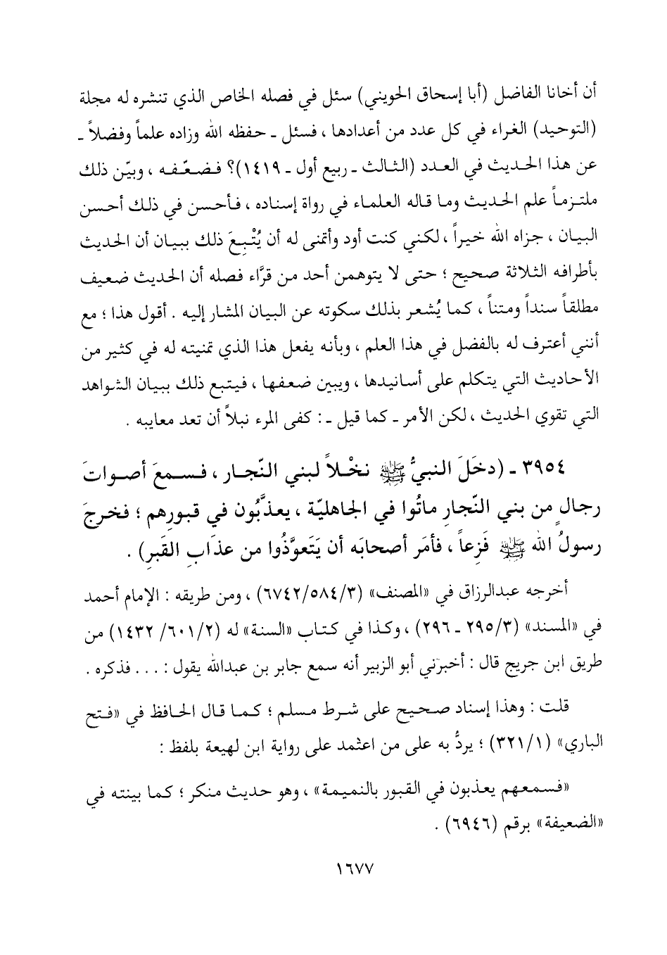أن أخانا الفاضل (أبا إسحاق الحويني) سئل في فصله الخاص الذي تنشره له مجلة (التوحيد) الغراء في كل عدد من أعدادها، فسئل- حفظه الله وزاده علماً وفضلاً- عن هذا الحديث في العدد (الثالث- ربيع أول- 1419) ؟ فضعفه، وبين ذلك ملتزماً علم الحديث وما قاله العلماء في رواة إسناده، فأحسن في ذلك أحسن البيان، جزاه الله خيراً، لكني كنت أود وأتمنى له أن يُتْبِعَ ذلك ببيان أن الحديث بأطرافه الثلاثة صحيح؛ حتى لا يتوهمن أحد من قراء فصله أن الحديث ضعيف مطلقاً سنداً ومتناً، كما يشعر بذلك سكوته عن البيان المشار إليه. أقول هذا؛ مع أنني أعترف له بالفضل في هذا العلم، وبأنه يفعل هذا الذي تمنيته له في كثير من الأحاديث التي يتكلم على أسانيدها، ويبين ضعفها، فيتبع ذلك ببيان الشواهد التي تقوي الحديث، لكن الأمر- كما قيل-: كفى المرء نبلاً أن تعد معايبه. *