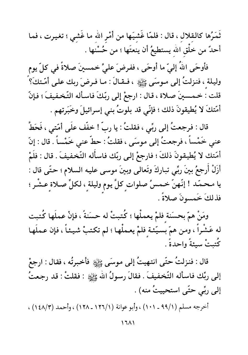قال: فرجعتُ إلى ربِّي، فقلت: يا رب! خفّف على أمتي، فحَطَّ عني خمساً، فرجعتُ إلى موسى، فقلتُ: حطّ عني خمساً. قال: إنَّ أمتك لا يطيقون ذلك؛ فارجع إلى ربك فاسأله التخفيف. قال: فلم أزل أرجع بين ربي تبارك وتعالى وبين موسى عليه السلام؛ حتى قال: يا محمد! إنَّهن خمسُ صلوات كل يوم وليلة، لكلِّ صلاة عشر؛ فذلك خمسون صلاة.