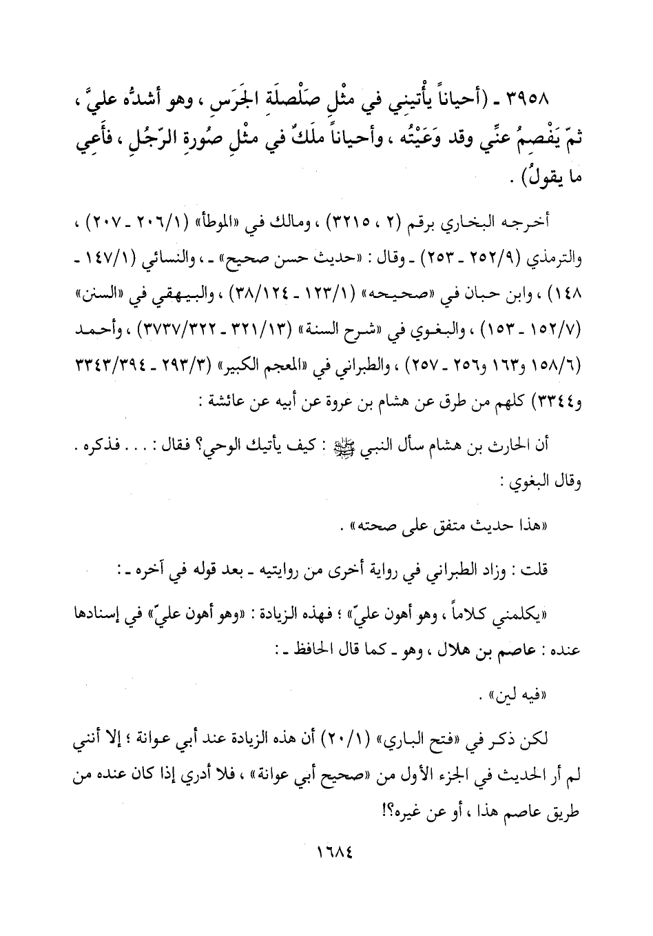3958- (أحياناً يأتينِي في مثل صَلصلَةِ الجَرَسِ، وهو أشدُّه عليَّ، ثمّ يَفصِمُ عنِّي وقد وَعَيتُه، وأحياناً ملَكٌ في مثلِ صُورِة الرّجُلِ، فأَعِي ما يقولُ) .