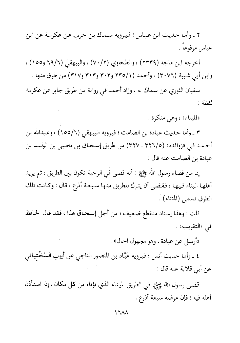 قضى رسول الله- صلى الله عليه وسلم -في الطريق الميتاء الذي تؤتاه من كل مكان، إذا استأذن أهله فيه؛ فإن عرضه سبعة أذرع.