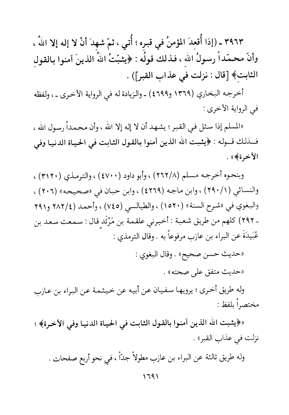 3963- (إذا أُقعِدَ المؤمنُ في قبرِه؛ أُتي، ثمّ شهِدَ أن لا إله إلا اللهُ، وأنّ محمّداً رسولُ اللهِ، فذلك قولُه: (يثبّتُ اللهُ الذينَ آمنوا بالقولِ الثابتِ) [قال: نزلت في عذاب القبر] ) .