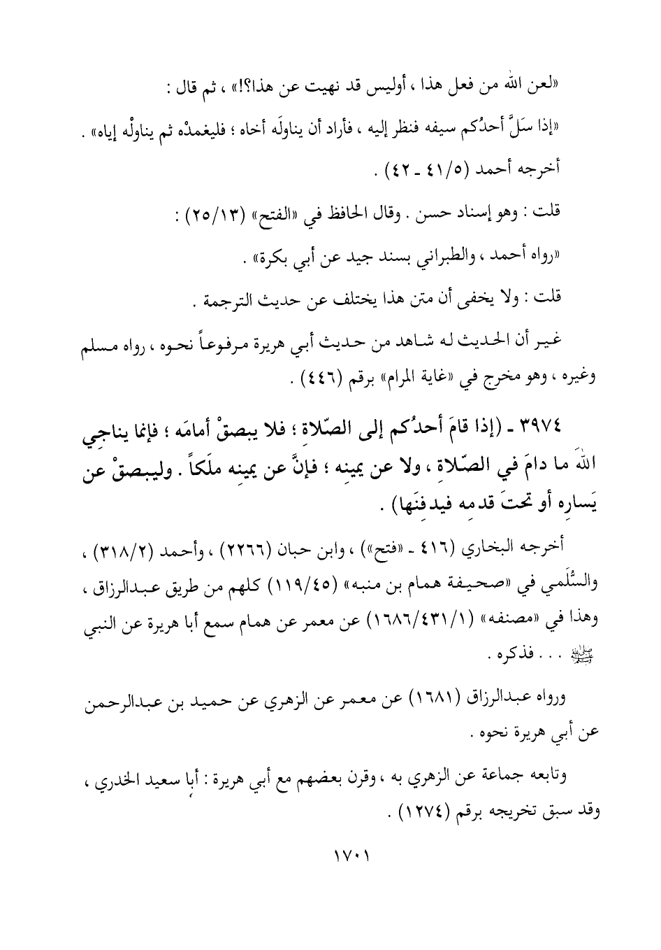 أخرجه البخاري (416- "فتح ") ، وابن حبان (2266) ، وأحمد (2/318) ، والسلمي في "صحيفة همام بن منبه " (45/119) كلهم من طريق عبد الرزاق، وهذا في "مصنفه " (1/431/1686) عن معمر عن همام سمع أبا هريرة عن النبي- صلى الله عليه وسلم - ... فذكره.