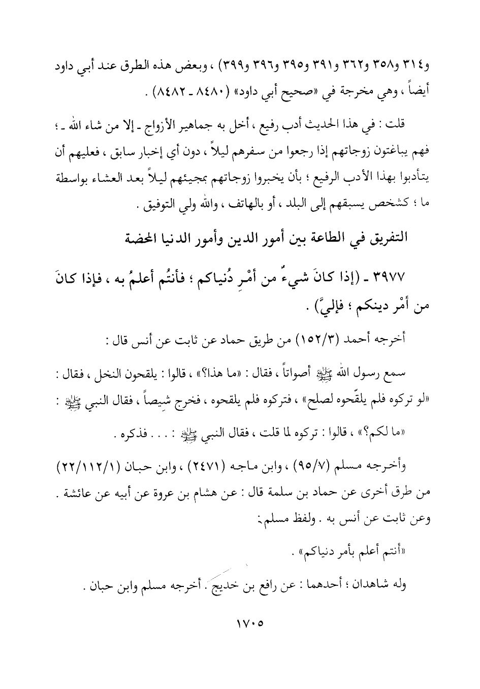 3977- (إذا كانَ شيءٌ من أمرِ دُنياكم؛ فأنتُم أعلمُ به، فإذا كانَ من أمر دينكم؛ فإليَّ) .