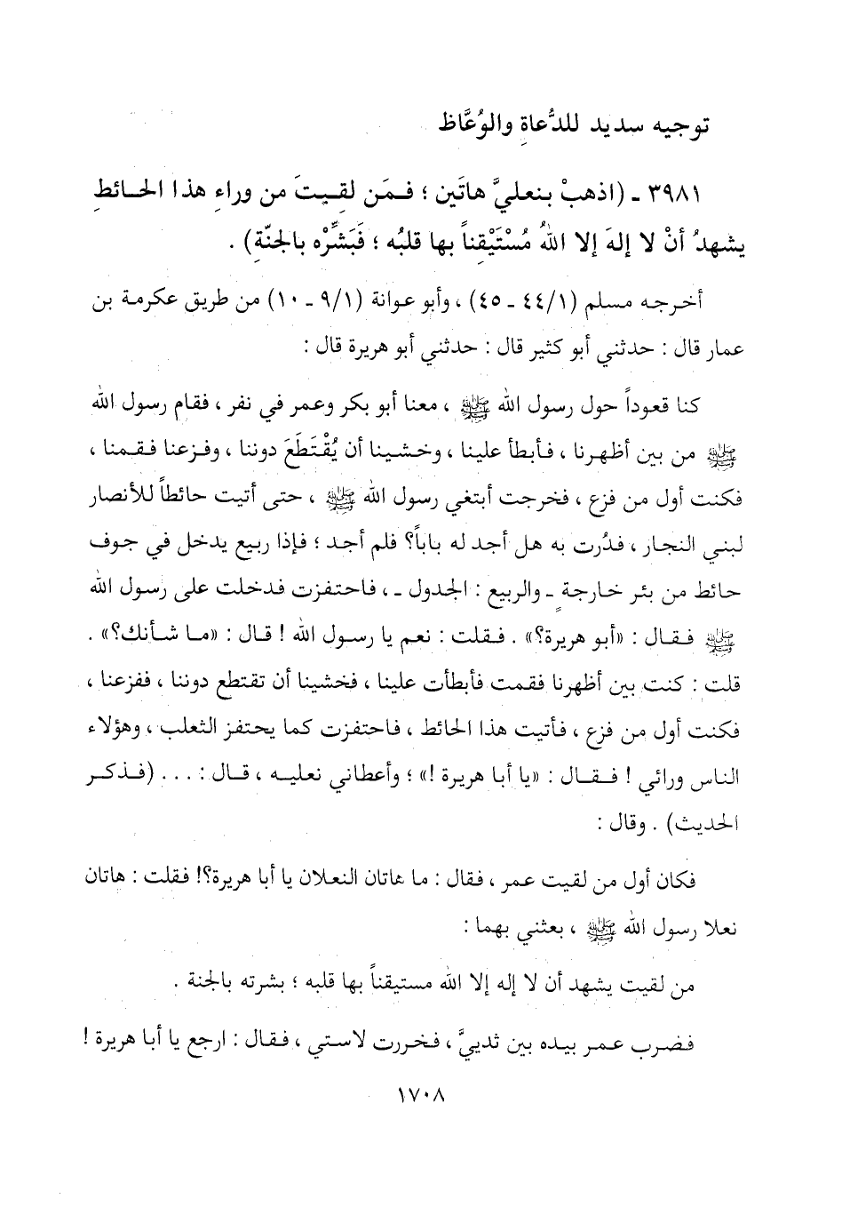 3981- (اذهب بنعليِّ هاتَين؛ فمَن لقِيتَ من وراءِ هذا الحائط يشهدُ أن لا إله إلا الله مُستَيقِناً بها قلبُه؛ فَبَشِّره بالجنّةِ) .