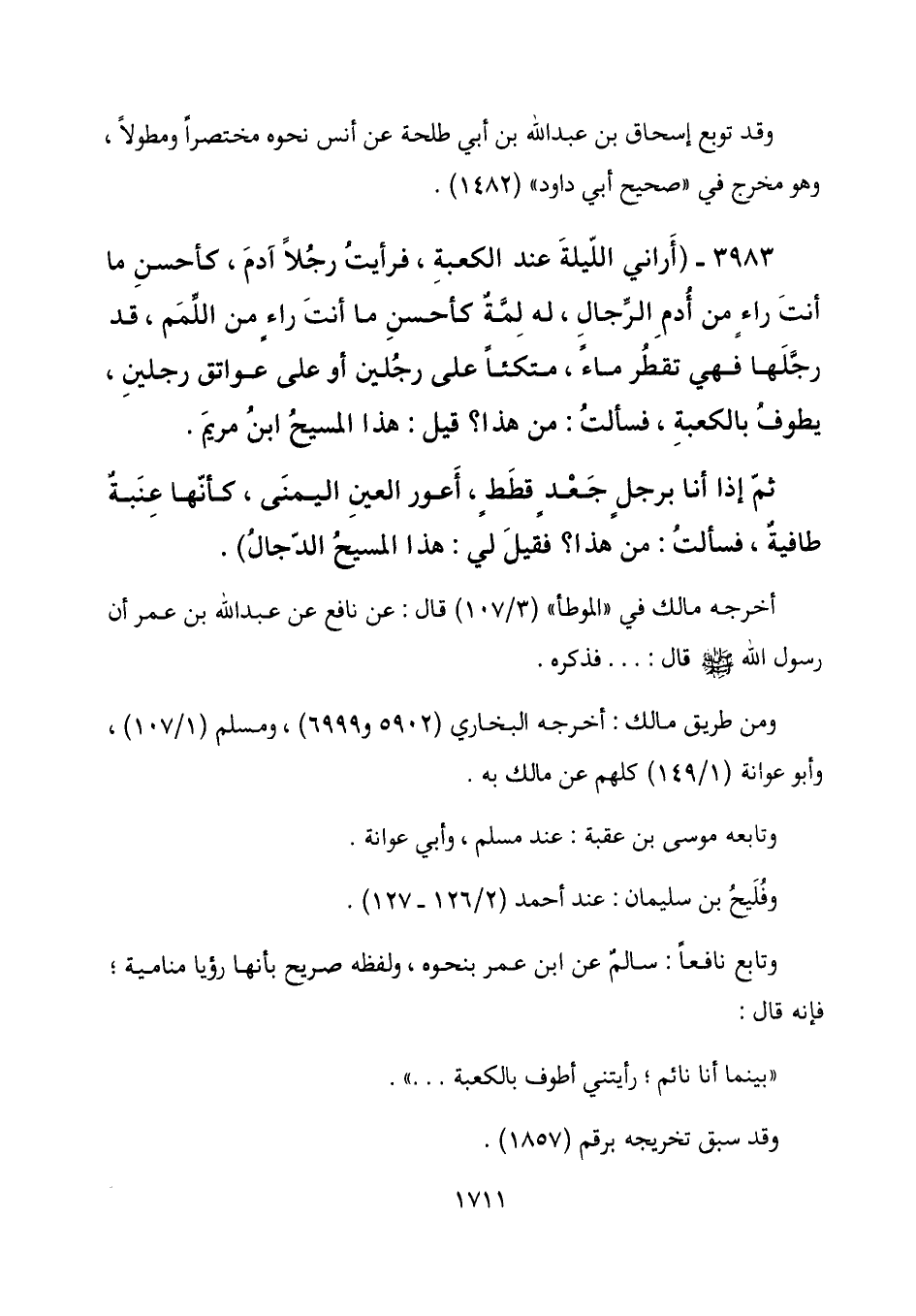3983- (أَراني اللّيلةَ عند الكعبةِ، فرأيتُ رجُلاً آدمَ، كأحسنِ ما أنتَ راءٍ من أُدمِ الرِّجالِ، له لِمَّةٌ كأحسنِ ما أنتَ راءٍ من اللِّمَم، قد رجَّلَها فهي تقطُر ماءً، متكئاً على رجُلين أو على عواتق رجلينِ، يطوفُ بالكعبةِ، فسألتُ: من هذا؟ قيل: هذا المسيحُ ابنُ مريمَ.