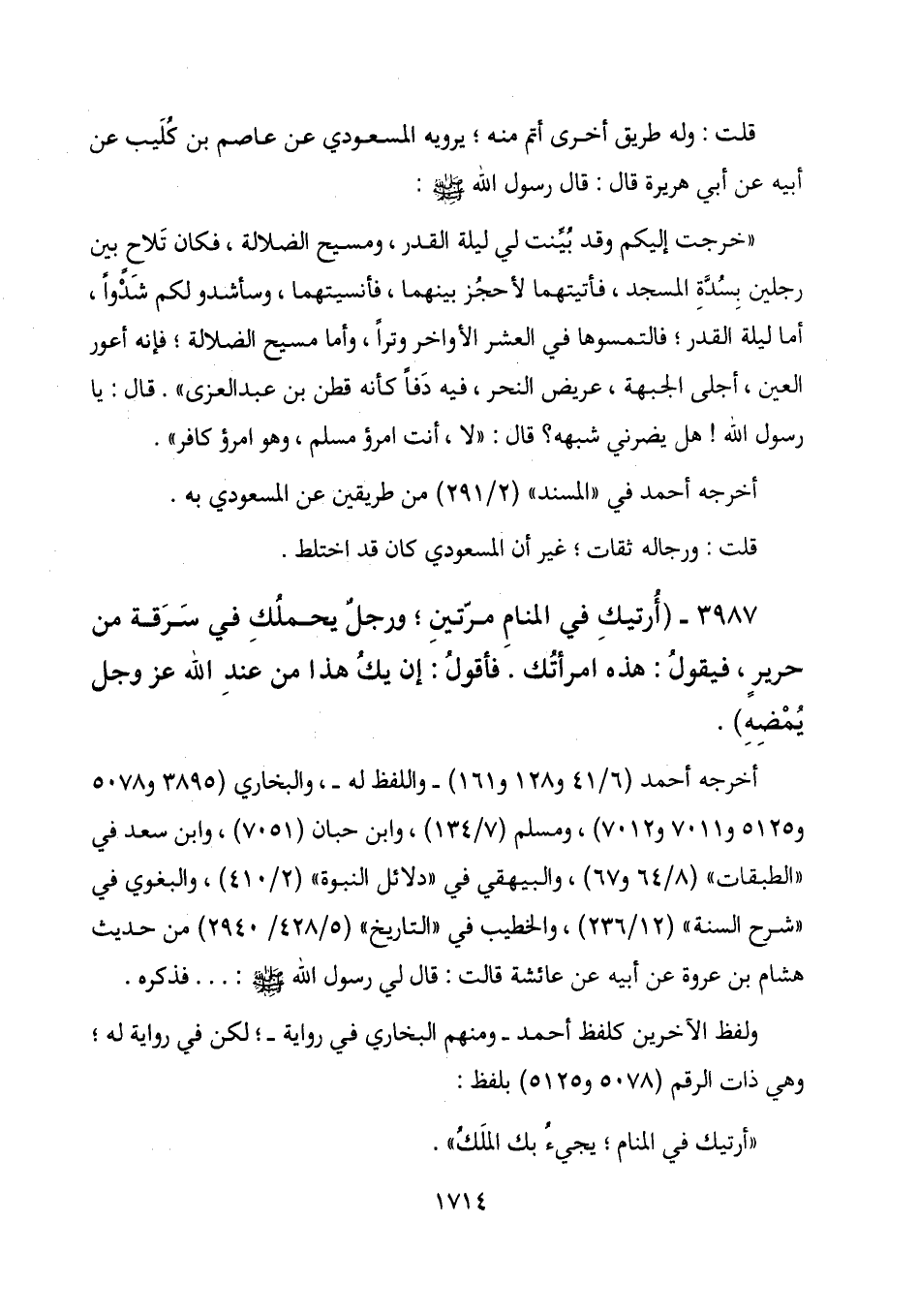 3987- (أُرتيكِ في المنامِ مرّتينِ؛ ورجلٌ يحملُك في سَرَقة من حريرٍ، فيقولُ: هذه امرأتُك. فأقولُ: إن يكُ هذا من عندِ الله عز وجل يُمضِهِ) .