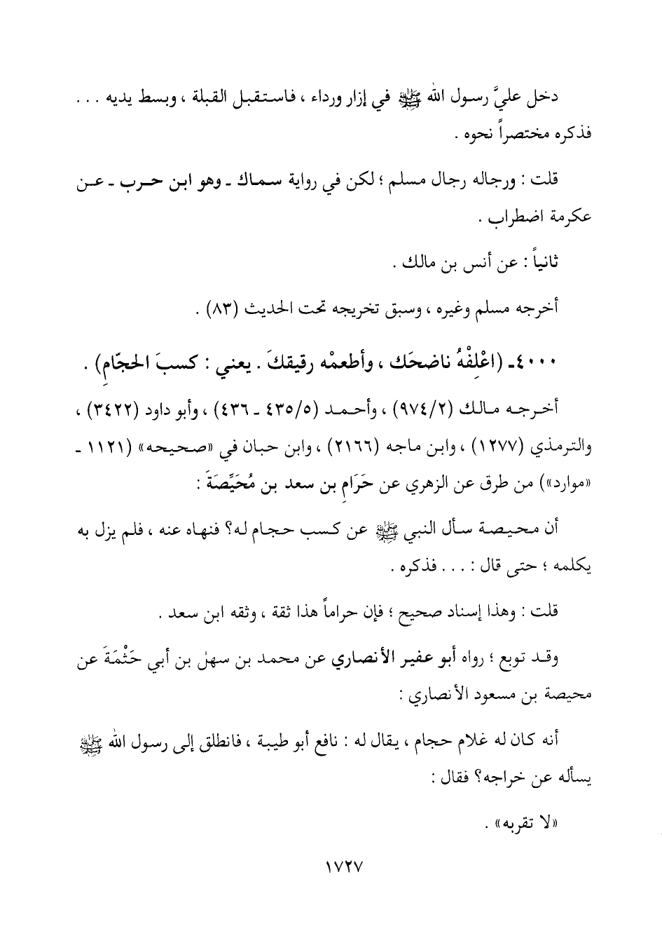 أن محيصة سأل النبي - صلى الله عليه وسلم - عن كسب حجام له؟ فنهاه عنه، فلم يزل به يكلمه؛ حتى قال: ... فذكره.