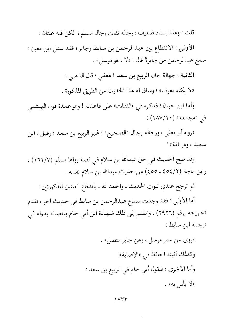 الأولى: الانقطاع بين عبد الرحمن بن سابط وجابر؛ فقد سئل ابن معين: سمع عبد الرحمن من جابر؟ قال: "لا، هو مرسل ".
