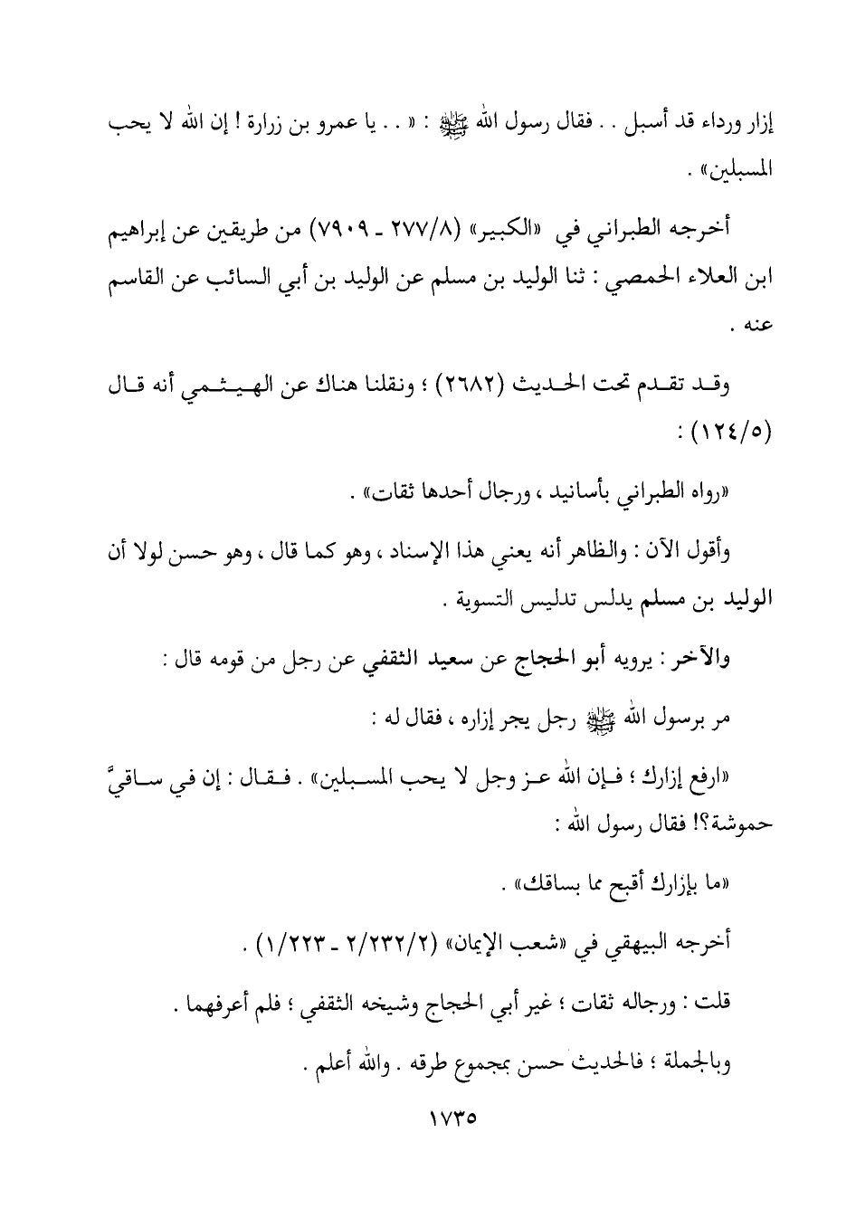 إزار ورداء قد أسبل.. فقال رسول الله- صلى الله عليه وسلم -: ".. يا عمرو بن زرارة! إن الله لا يحب المسبلين ".
