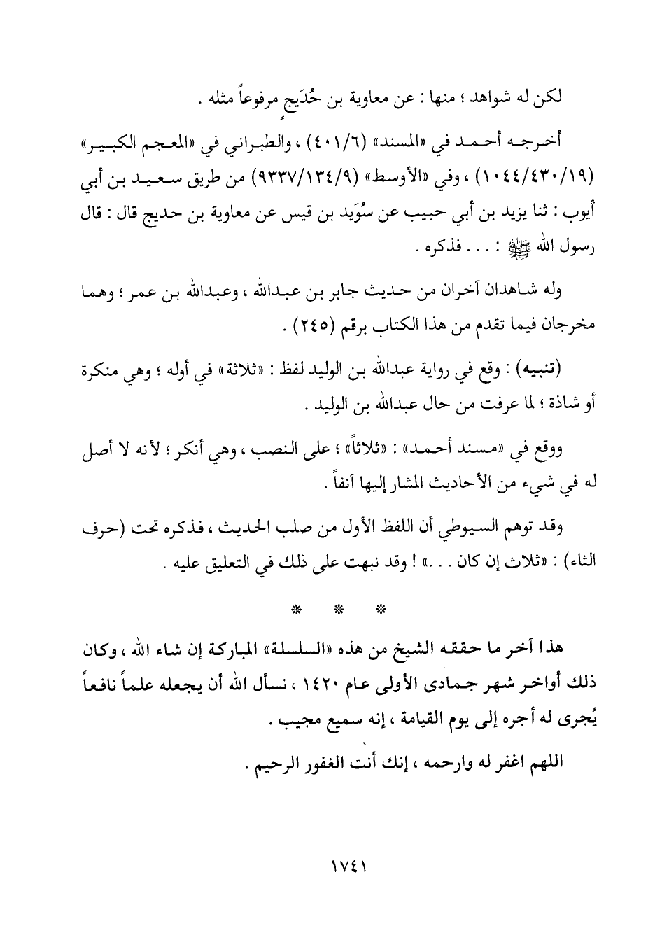 هذا آخر ما حققه الشيخ من هذه "السلسلة" المباركة إن شاء الله، وكان ذلك أواخر شهر جمادى الأولى عام 1420، نسأل الله أن يجعله علماً نافعاً يجرى له أجره إلى يوم القيامة، إنه سميع مجيب.