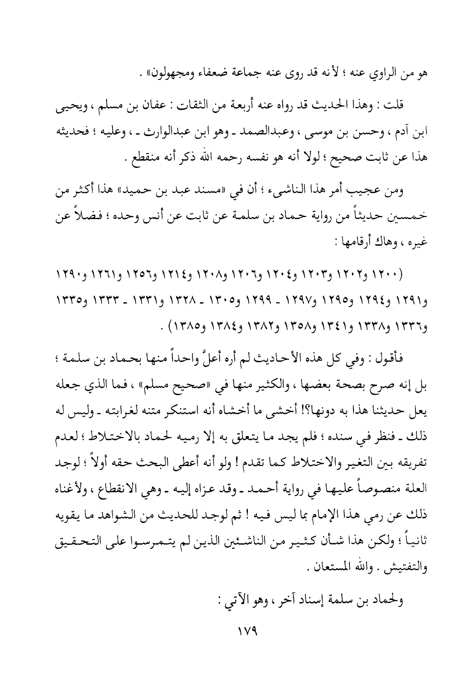 فأقول: وفي كل هذه الأحاديث لم أره أعل واحداً منها بحماد بن سلمة؛ بل إنه صرح بصحة بعضها، والكثير منها في "صحيح مسلم "، فما الذي جعله يعل حديثنا هذا به دونها؟ ! أخشى ما أخشاه أنه استنكر متنه لغرابته - وليس له ذلك - فنظر في سنده؛ فلم يجد ما يتعلق به إلا رميه لحماد بالاختلاط؛ لعدم تفريقه بين التغير والاختلاط كما تقدم! ولو أنه أعطى البحث حقه أولاً؛ لوجد العلة منصوصاً عليها في رواية أحمد- وقد عزاه إليه- وهي الانقطاع، ولأغناه ذلك عن رمي هذا الإمام بما ليس فيه! ثم لوجد للحديث من الشواهد ما يقويه ثانياً؛ ولكن هذا شأن كثير من الناشئين الذين لم يتمرسوا على التحقيق والتفتيش. والله المستعان.