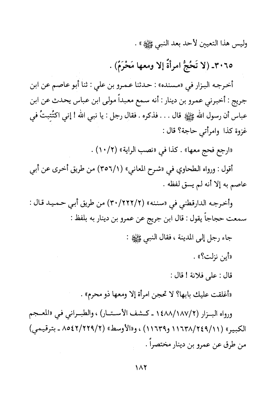 3065- (لا تَحُجُّ امرأةٌ إلا ومعها مَحْرَمٌ) .