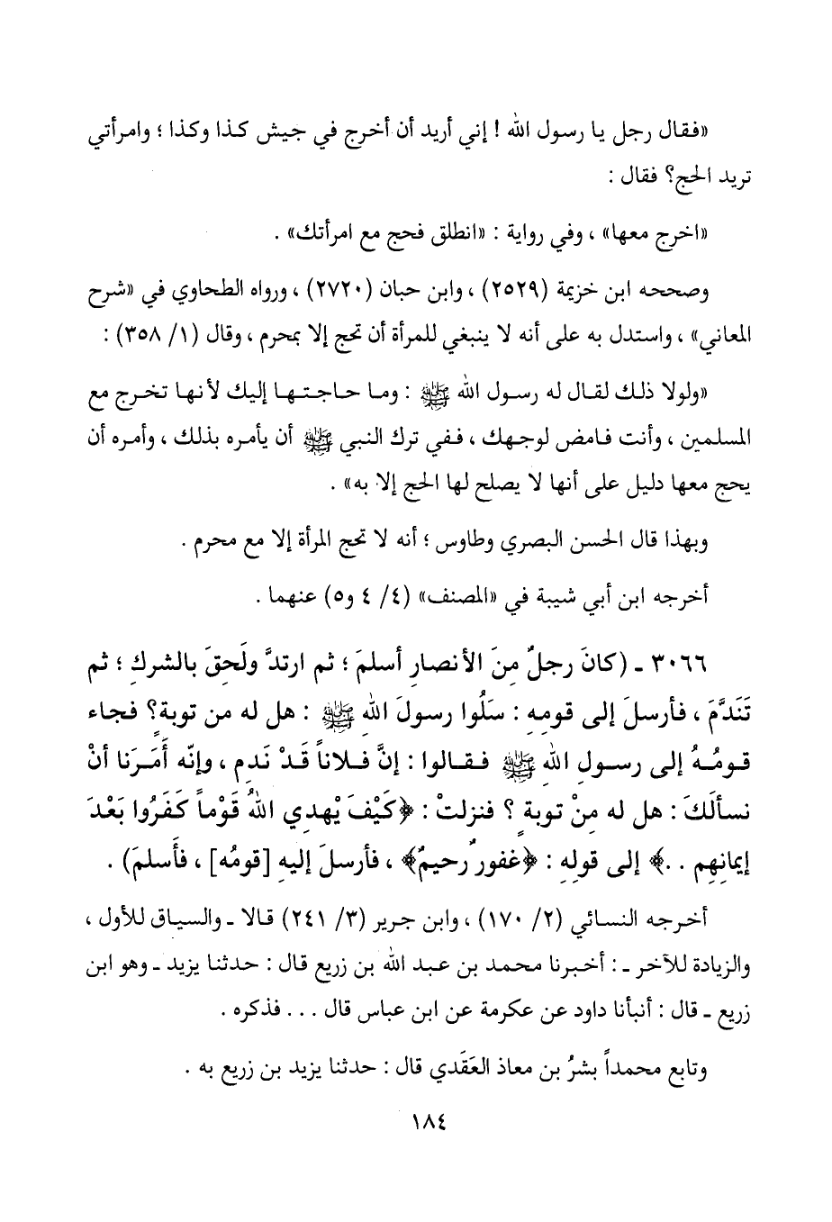 " ولولا ذلك لقال له رسول الله - صلى الله عليه وسلم -: وما حاجتها إليك لأنها تخرج مع المسلمين، وأنت فامض لوجهك، ففي ترك النبي - صلى الله عليه وسلم - أن يأمره بذلك، وأمره أن يحج معها دليل على أنها لا يصلح لها الحج إلا به ".