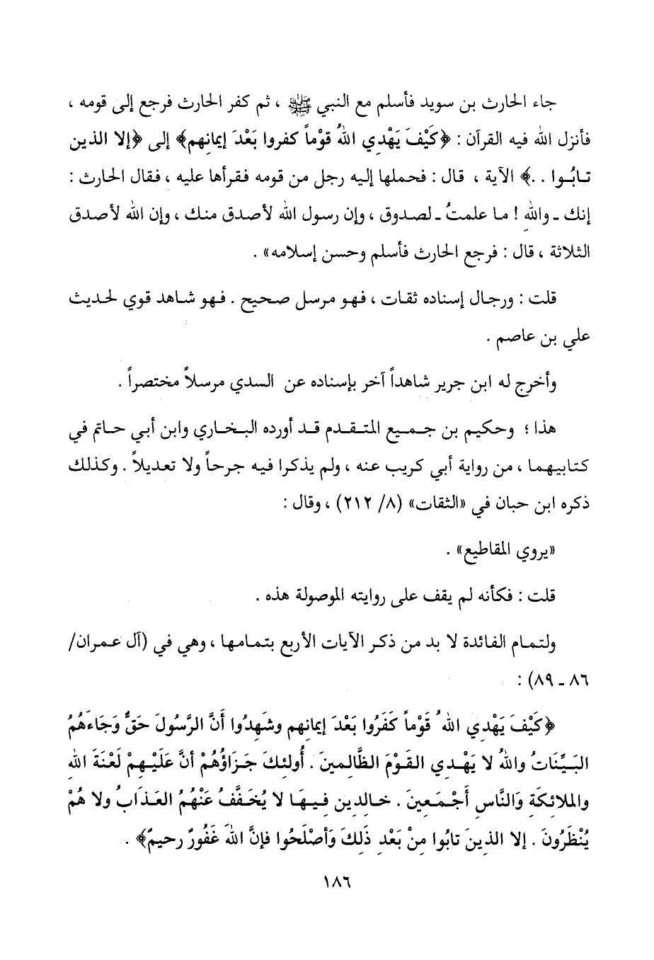 قلت: فكأنه لم يقف على روايته الموصولة هذه. ولتمام الفائدة لا بد من ذكر الآيات الأربع بتمامها، وهي في (آل عمران/ 86 ـ89) :