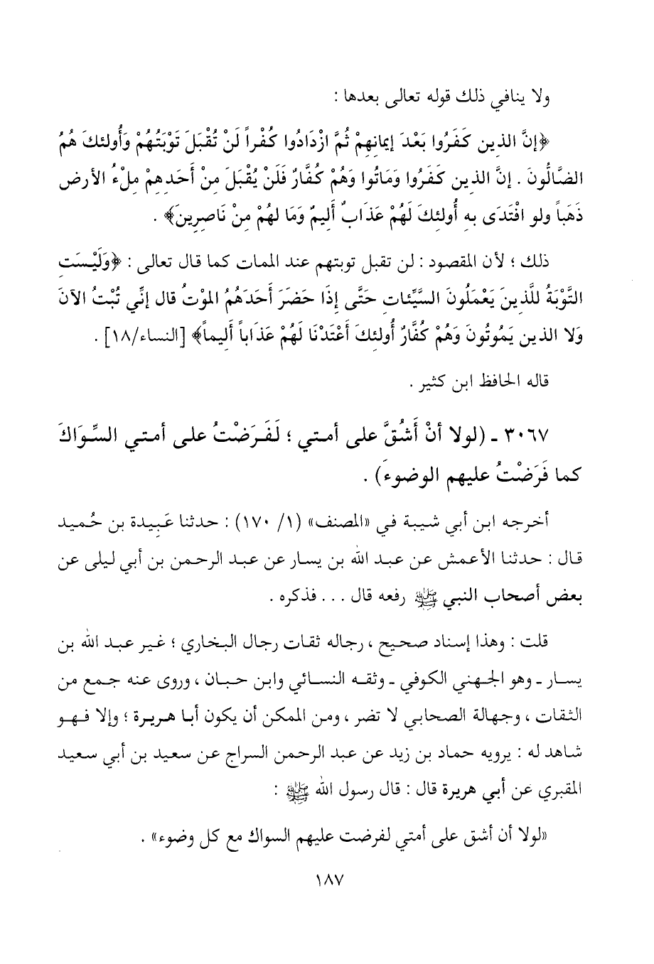 3067- (لولا أن أشُقَّ على أمتي؛ لَفَرَضْتُ على أمتي السِّوَاكَ كما فَرَضْتُ عليهم الوضوءَ) .