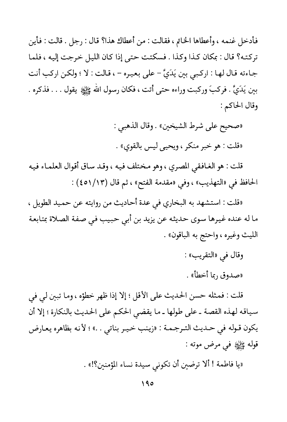 قلت: فمثله حسن الحديث على الأقل؛ إلا إذا ظهر خطؤه، وما تبين لي في سياقه لهذه القصة- على طولها- ما يقضي الحكم على الحديث بالنكارة؛ إلا أن يكون قوله في حديث الترجمة: "زينب خير بناتي.. "؛ لأنه بظاهره يعارض قوله - صلى الله عليه وسلم -في مرض موته: