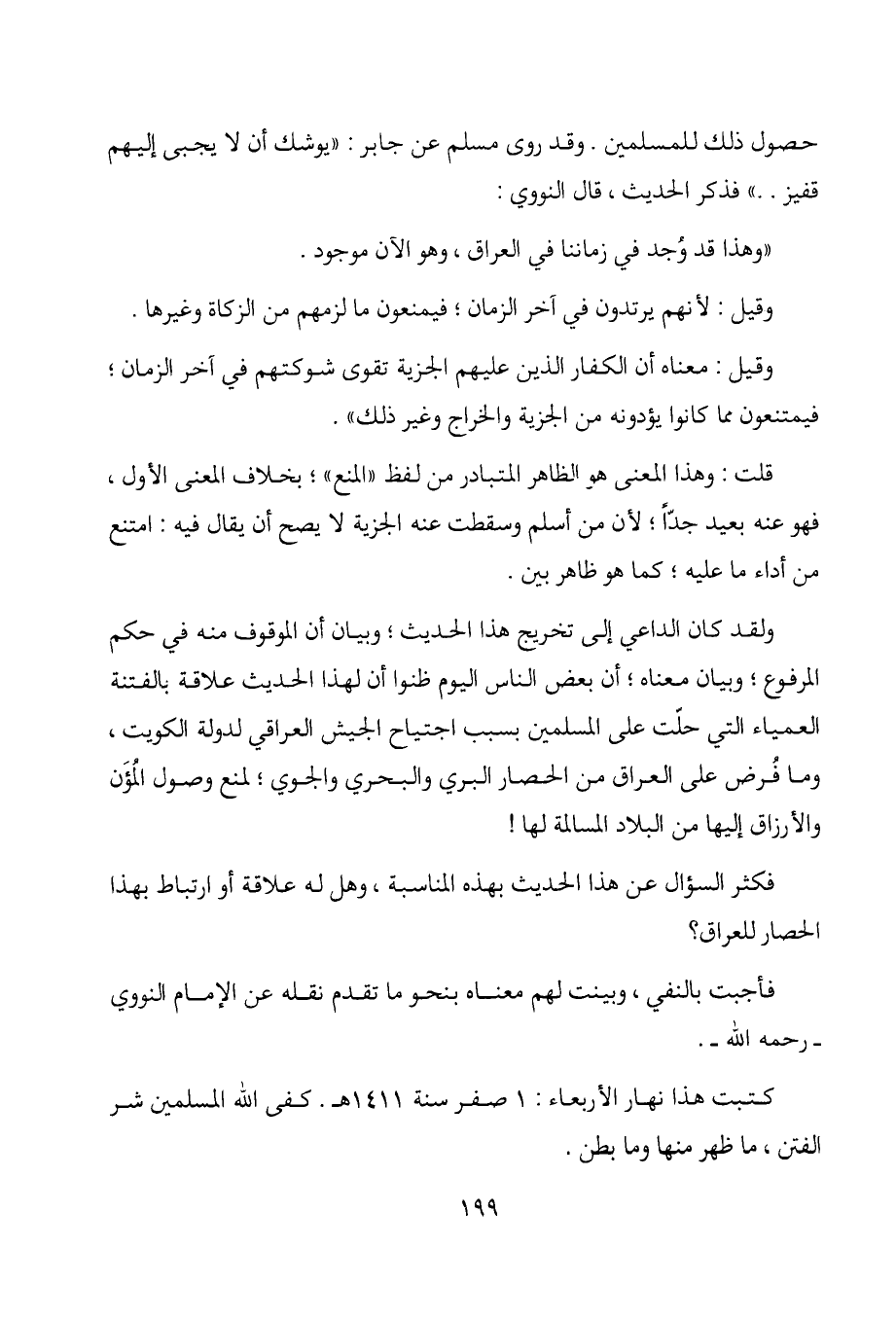 كتبت هذا نهار الأربعاء: 1 صفر سنة 1411هـ. كفى الله المسلمين شر الفتن ماظهر منها وما بطن. *