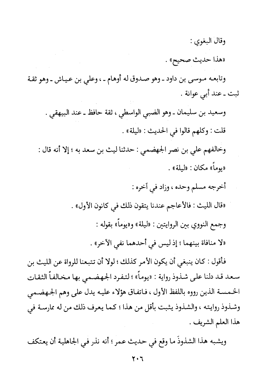 فأقول: كان ينبغي أن يكون الأمر كذلك؛ لولا أن تتبعنا للرواة عن الليث بن سعد قد دلنا على شذوذ رواية: "يوما"؛ لتفرد الجهضمي بها مخالفاً الثقات الخمسة الذين رووه باللفظ الأول، فاتفاق هؤلاء عليه يدل على وهم الجهضمي وشذوذ روايته، والشذوذ يثبت بأقل من هذا؛ كما يعرف ذلك من له ممارسة في هذا العلم الشريف.